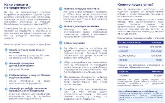 Да би се непокретност уписала, потребно је пријавити објекта путем дигиталне платформе коју успоставља Агенција за просторно планирање и урбанизам, уз подршку РГЗ-а.