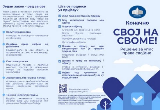 Нови Закон о посебним условима за евидентирање и упис права на непокретностима (у јавности познат као закон о легализацији) даје грађанима прилику да буду регистровани као власници објеката у којима живе или раде, и ставља тачку на нелегалну градњу, пише на сајту Републичког геодетског завода (РГЗ) уз боршуру како изгледа поступак пријаве.